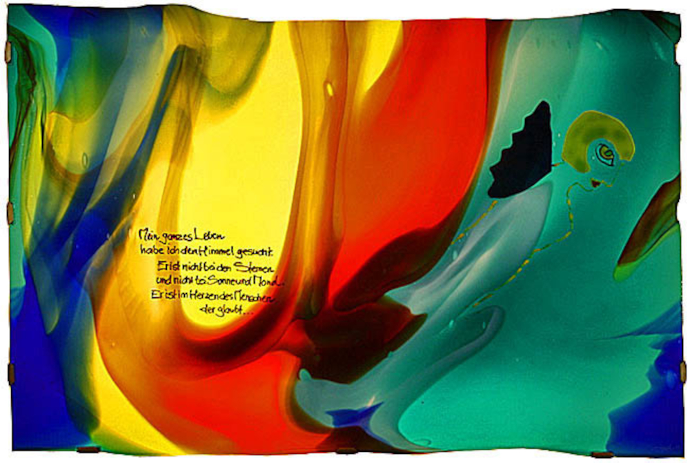 Der Zugang zum Farbglas gelang mir 1980 über die berühmten Lampen L.C. Tiffanys. Heute, nach vielen Jahren der Auseinandersetzung und des Experimentierens mit farbigem Flachglas, ist es immer wieder diese Glasbild-Collage, die in ihrer ständig wechselnden Lesbarkeit und Lebendigkeit mir ein ideales Ausdrucks- und Gestaltungsmittel ist.